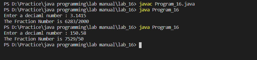16). Write a program that prompts the user to enter a decimal number and displays the number in a fraction. Hint: Read the decimal number as a string, extract the integer part and fractional part from the string